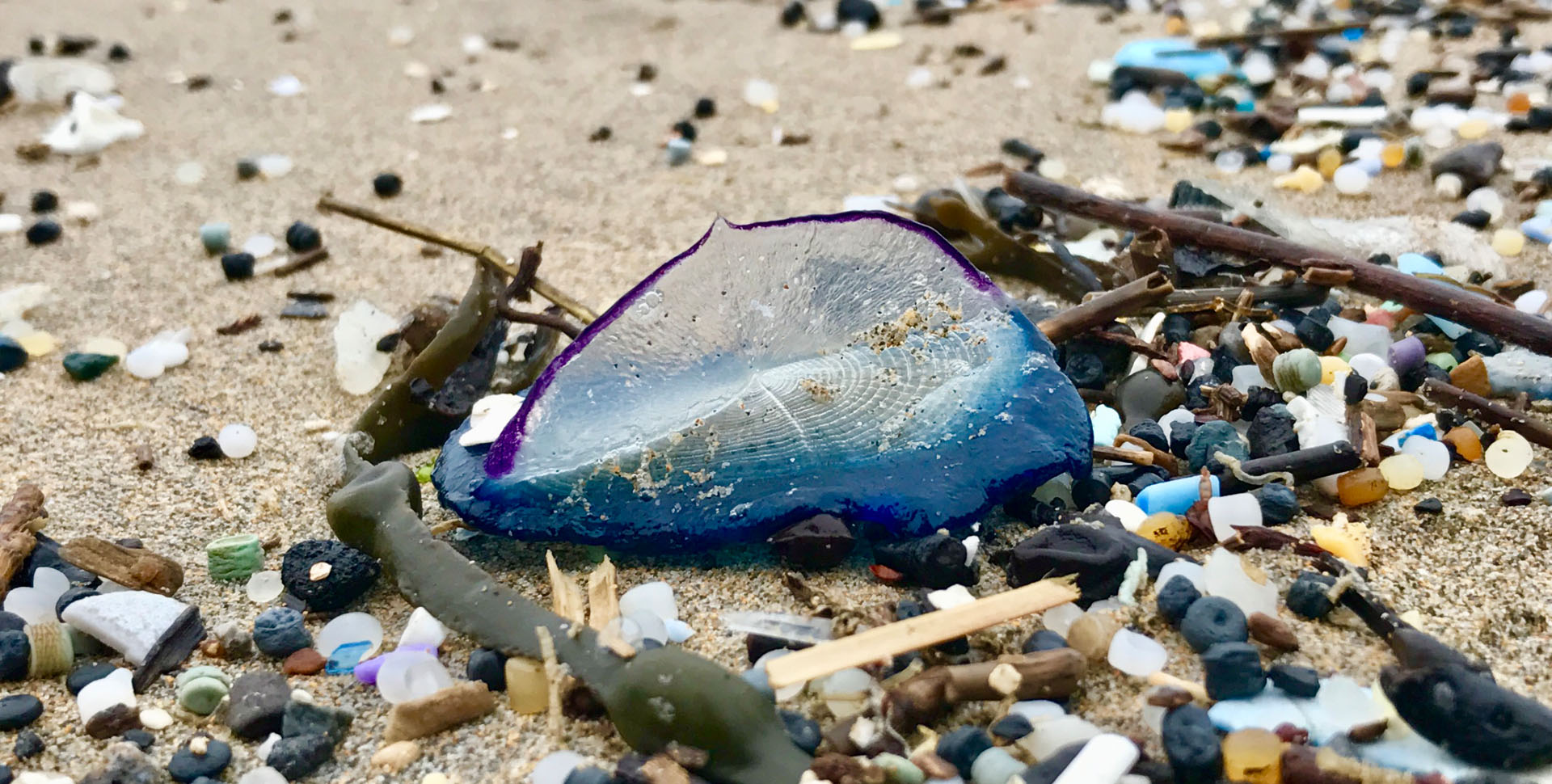 Velella or a 'By the wind sailor' amongst nurdles on a beach.