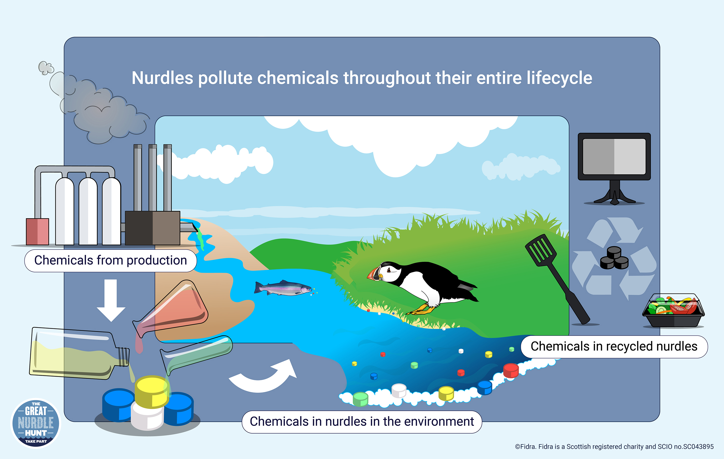 Infographic showing how nurdles can pollute toxic chemicals throughout their whole lifecycle.