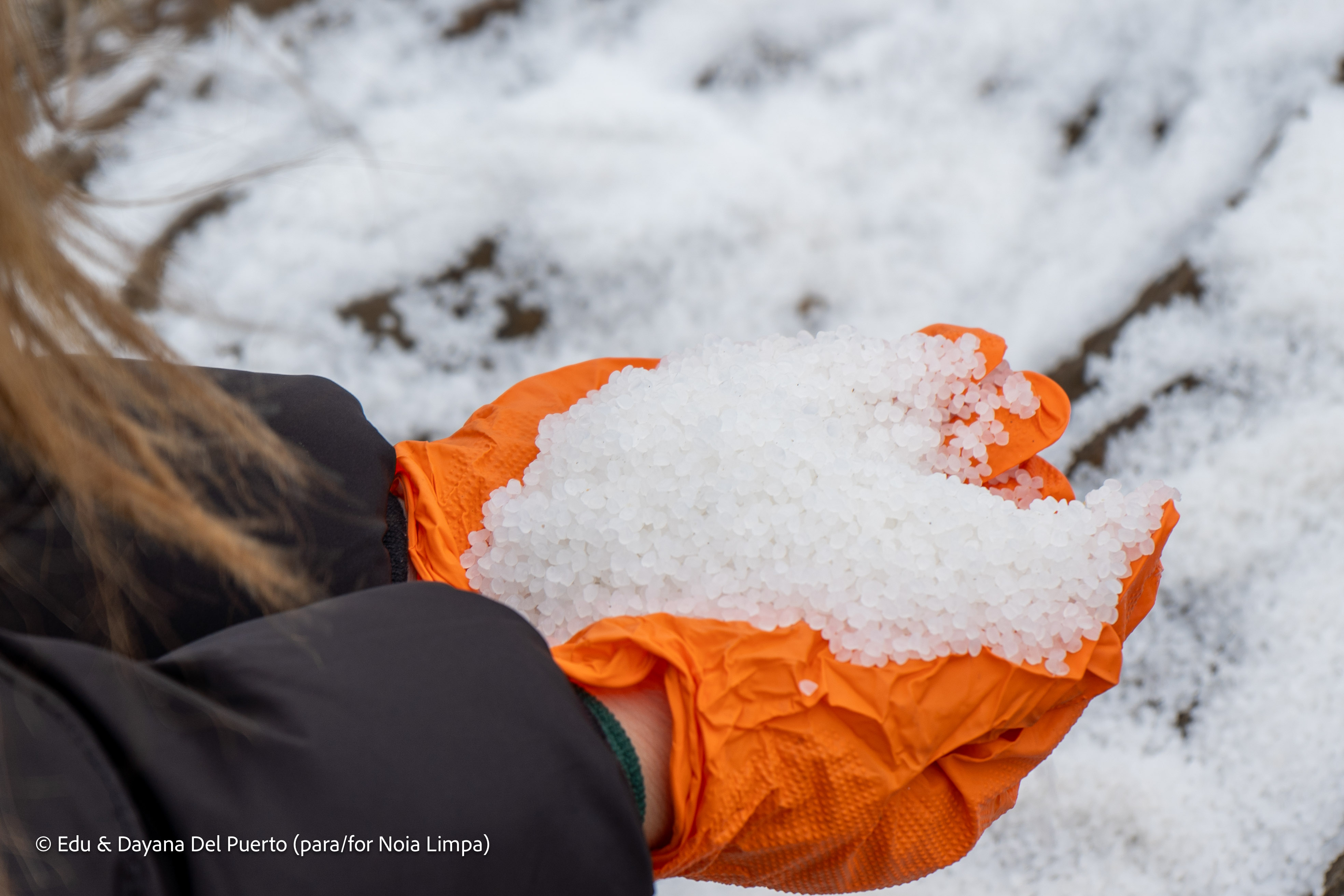 Nurdles in gloved hands, Galicia, Spain