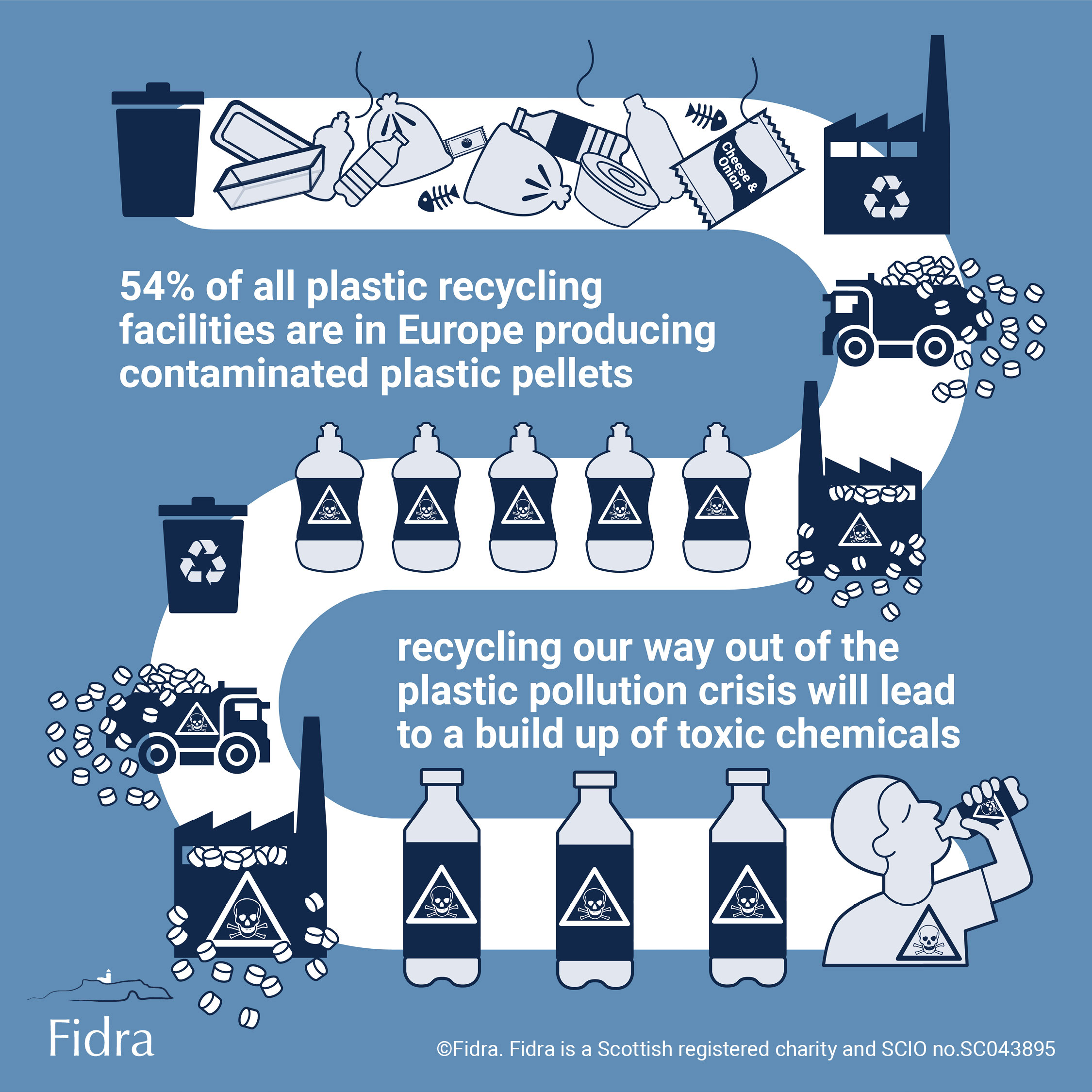 Infographic demonstrating how recycling our way out of the plastic pollution crisis will cause a build up of toxic chemicals.